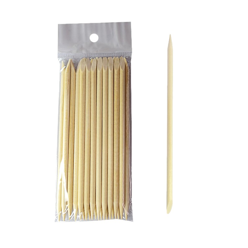 Cada varilla tiene dos extremos, un extremo puntiagudo y un extremo plano, el extremo puntiagudo se puede aplicar para limpiar el esmalte de uñas fuera de tus uñas y otros lugares estrechos con una envoltura de algodón absorbente, el extremo plano se adapta para limpiar las uñas y empujar las cutículas.